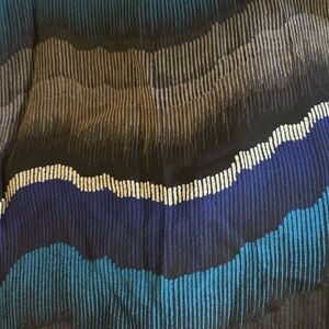 Chic midi dress with blue and black wave pattern. Flattering V-neck and cinched waist. Perfect for stylish outings.