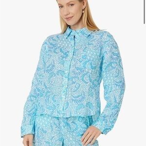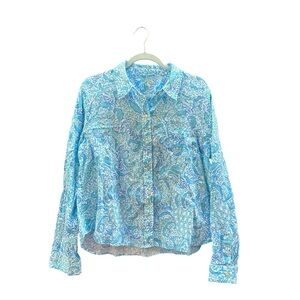Keywords: Lilly Pulitzer, women's button-up, multicolor, geometric pattern, casual shirt, spring fashion, lightweight, breathable, collared shirt, long sleeve, cotton blend, machine washable, pre-owned, regular fit, casual occasions.
