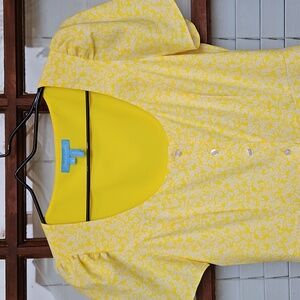 From Draper James: Hello, sunshine. The Bonnie Midi Dress is cut from a yellow matte satin in one of our signature floral prints and finished with great details like a scoop neck and on-seam pockets. It's a great party dress — just add heels — but will also work for brunch (or a baby shower) with a jean jacket and sandals. - Matte Poly Satin (100% Polyester) - Length: 36" - Scoop neck - Lined in bodice and in skirt, not in sleeve - Center front button closure - On seam pockets - Machine wash cold with like colors. Tumble dry low. Cool iron. Do not bleach. 17" armpit to armpit, 14" waist.