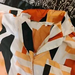 Stylish geometric print pajama set. Button-up top with matching pants. Ideal for comfort and style.Like new condition.For measurements please see pictures