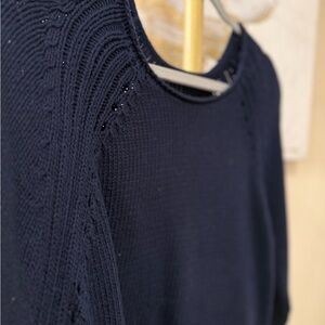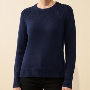 Stay cozy and stylish with this elegant navy blue pointelle-knit sweater, perfect for any occasion. The delicate openwork detailing gives it a refined, feminine look while remaining versatile enough for everyday wear. Purchased directly from the J.Crew retail store at Rockefeller Plaza in NYC (not from a factory or outlet location).