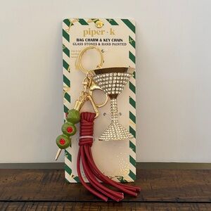 Stylish Piper-K bag charm/ keychain with a dazzling gold martini charm. Features a green bead olives and red tassel for a chic look. Dress up your bag.
