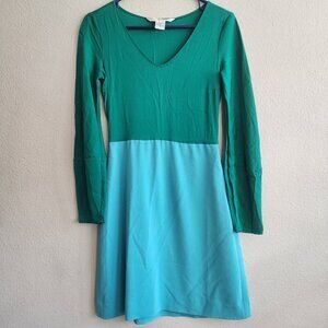 Long sleeve skater silhouette with colorblock green upper and light blue skirt