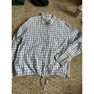 Talbots Top Women L Drawstring Blue Linen Gingham Plaid Long Sleeve Capsule VTG