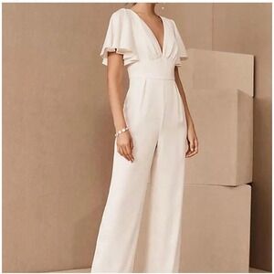 A chic square back lends this satin jumpsuit a modern edge, while flutter sleeves and wide legs create an elegant silhouette.