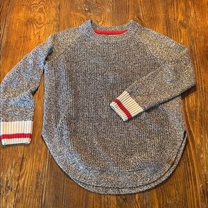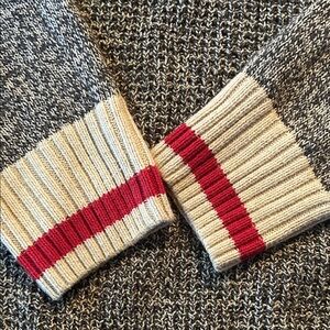 Cozy gray knit sweater. Red accents on collar and cuffs. Perfect for casual wear.