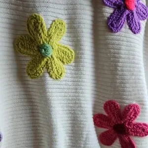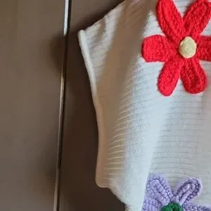Adorable round neck short sleeved sweater with embroidered colorful flowers. Viscose, acrylic blend. 24" inches across the bust and 23" inches from shoulder to hem. NWT