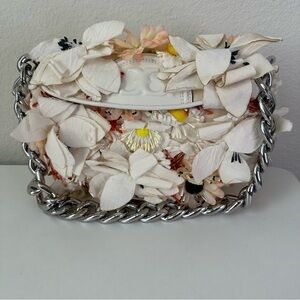The Mini Fleming Soft Floral Embellished Bag by Tory Burch combines playful charm with practical elegance. Adorned with three-dimensional flowers and featuring a chunky chain strap, this bag ensures both style and functionality. Carry it tucked under the arm or across your body with the removable strap for a versatile statement piece.