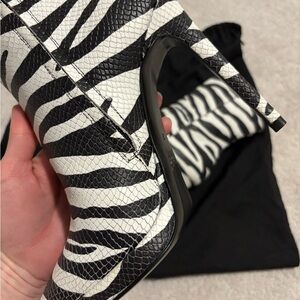 Step out in style with these zebra print heeled boots. Featuring a striking black and white pattern, these boots are perfect for making a bold fashion statement. The sleek design and high heel add a touch of elegance to any outfit.