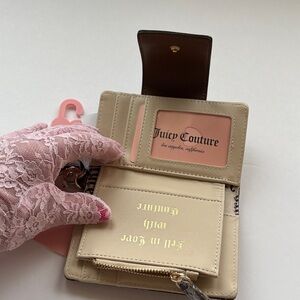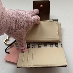 Chic brown wallet with cherries,hearts,strawberries,and bows. Includes heart keychain. Snap closure and zipper coin slot. Plenty of room for credit cards. Prefect for the Juicy lover. NWT