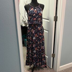 Navy blue w/ multicolored floral pattern; halter neckline w/ braided trim; sleeveless; elastic waist; back keyhole w/button closure; straight hem 100% rayon