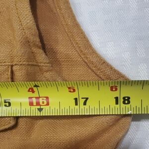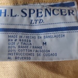 Elegant tan maxi dress by H.L. Spencer. Features a sleeveless design with a button-up front and multiple pockets.