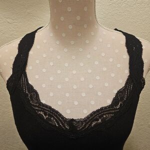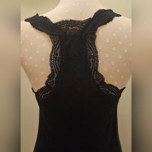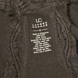This is a set of 2 ribbed racerback tank tops. They are by Lauren Conrad, have longer lengths to add to their versatility, and feature lace details. Perfect for layering or wearing alone. Set includes: one off-white tank and one black tank in a Medium.