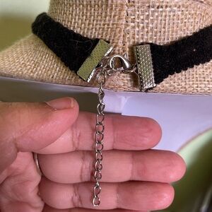 This elegant choker necklace features a striking black band adorned with a gold pendant and natural delicate pearl accents. Perfect for adding a touch of sophistication to any outfit.