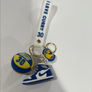 Stylish keychain set featuring a blue and yellow basketball and sneaker design. Perfect for fans.