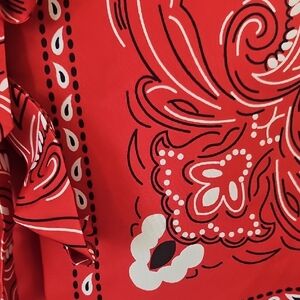 Bold red top with paisley design. Features a stylish tie front.
