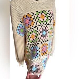 Cozy statement knit with colorful granny square crochet detailing.
