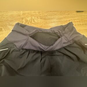 Stylish black athletic shorts. Features white trim. Perfect for workouts.