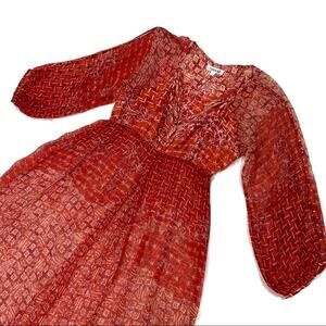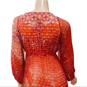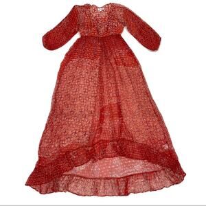 Poupette St Barth 100% Silk Print High-Low Tunic Maxi Dress size S. Sheer throughout. V-neckline. 3/4 sleeves. Elastic bust line. Ruffle hem details. Excellent preowned condition. No stains, no rips, no pulls. Measurements taken lying flat.