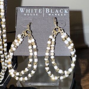 Chic multi-strand necklace with matching earrings. Features gold and white beads. Perfect for elegant occasions.