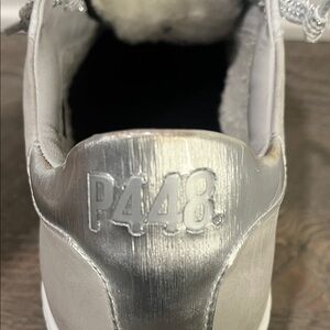 These P448 sneakers with metallic silver accents. Light gray suede and perforated sides. Lace-up closure for a modern look.