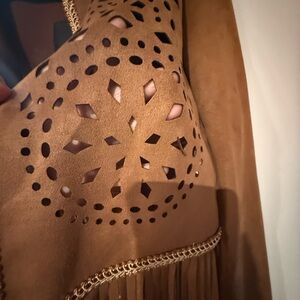 Elevate your style with this chic tan jacket featuring intricate cutout designs and playful fringe detailing. Perfect for adding a unique touch to any ensemble.