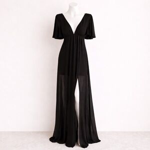 Elegant Show Me Your Mumu Faye Flutter Maxi Dress in classic black, featuring a deep V neckline, flutter sleeves, and flowing chiffon skirt.