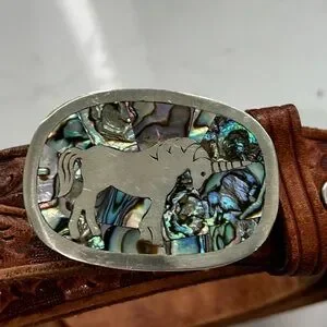 Brown leather belt featuring a unique unicorn design on an abalone shell buckle. Eye-catching and stylish.