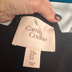 Camila Coelho black fine knit with Stretch body con with rhinestone silver straps Jeweled braided dress size medium gorgeous preowned sexy under arm to hem measures 35.5 inches, under arm to under arm measures 16 inches across one side