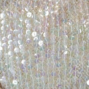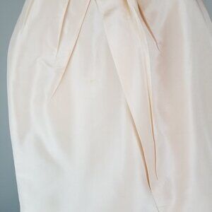Iridescent sequins set on gold metallic mesh net which overlays the silk bodice. Fitted peach champagne silk skirt which gathers to the right hip and is finished with a matching silk bow.