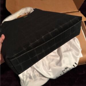 Crocodile-embossed suede Inside snap pocket Magnetic snap closure Handle with 10 1/2 drop 11 (L) x 11 (H) x 3 1/4 (W) Style No. CCJ00