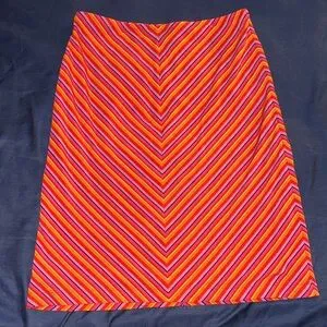 Stylish A-line skirt with vibrant chevron design. Features striking red and pink colors. Perfect for a bold look.