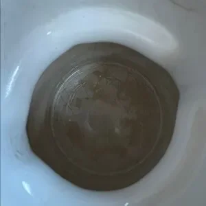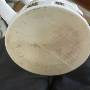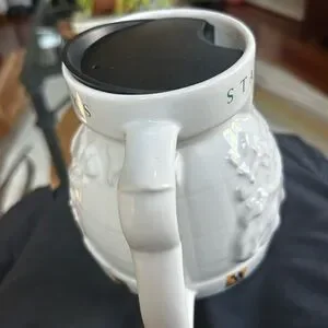 White ceramic with world map in relief around mug. Some staining inside but no chips cracks or outside damage