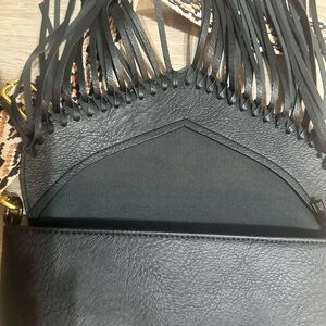 Black vegan crossbody bag with fringe. Comes with two guitar strap options. One boho style and one pink, black and gold leopard print. So fun for festivals, concerts or any fall outing. Only used once. Everything is like new condition.
