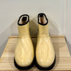Authentic UGG women’s waterproof ankle boots featuring a clear exterior and soft shearling lining. Comfortable, warm, and perfect for rain or winter weather. Rubber sole provides good traction.