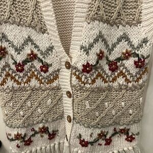 Embrace warmth and style with this elegant knit cardigan vest. Featuring a charming blend of cream and tan with intricate floral patterns, it's perfect for layering over your favorite outfits.