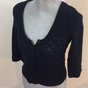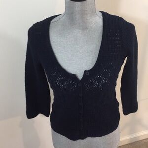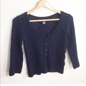 Like new navy blue button down cardigan. Crochet and cutout details. Super soft and stretchy. Made with cotton and viscose. It is an XS but it runs loose and could also fit a small. Bust is 17” across and length is 18.” No flaws