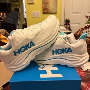 Hoka sneakers in white with teal highlights. Sleek and supportive design.The most comfortable and popular sneakers on the planet in an impossible sz to find!! I ship same day or next day!!! Can’t sell any lower than asking price!! Poshmark takes 20 percent which is basically my profit margin!!!