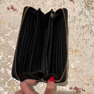 Chic black wallet by Kate Spade. Features a zip-around closure with ample credit card slots and a zippered pocket for coins.