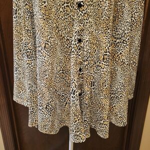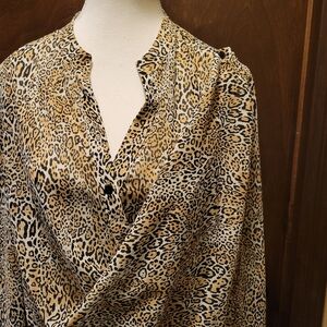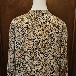 Elevate your style with this chic leopard print blouse. Perfect for any occasion, this top features a classic button-up design and a comfortable fit. Add a touch of wild elegance to your wardrobe. Can be worn THREE different ways!