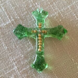 Elegant green glass cross pendant with gold toned accents, perfect for adding a touch of sophistication to your outfit.