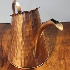 This vintage Gregorian solid copper small watering can pitcher jug is handmade in the United States. The hammered exterior gives it a unique and rustic appearance, adding character to any space. With its miniature size and traditional design, this pitcher jug is perfect for watering small plants or as a decorative accent in a garden setting. Its solid copper construction ensures durability and a long-lasting piece that will only become more charming with age.