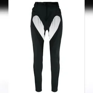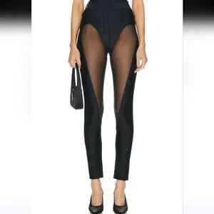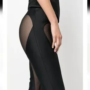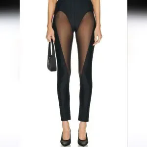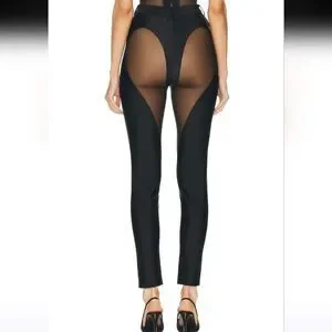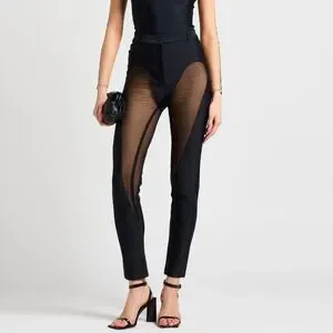 Mugler’s penchant for contoured silhouettes is displayed with these skinny trousers. The jersey construction is panelled with semi-sheer mesh inserts that create an illusionary effect.