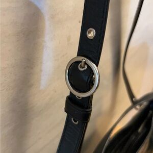 • It is a versatile shoulder bag made of black crinkled featuring a top handle and a detachable longer strap for shoulder or crossbody wear, as well as chunky silver hardware.