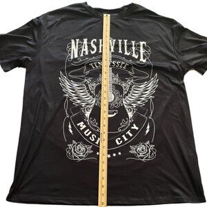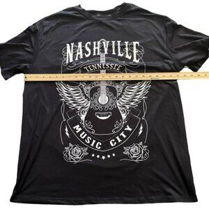 This plus size country and western T shirt features a beautiful bold graphic - Nashville Tennessee - Music City with a winged acoustic guitar and roses.