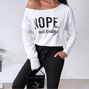 Stay cozy and stylishly relatable in this ChicMe graphic top. This lightweight white sweatshirt features a flattering, wide off-the-shoulder neckline and a relaxed fit, making it the perfect choice for a casual "stay-at-home" day or a low-key coffee run.