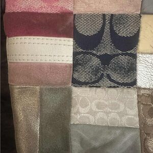 • Materials: The bag features a mix of materials, including Coach signature canvas, suede, and leather panels in various colors.