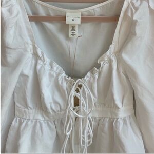 This elegant white lace-up blouse is perfect for any occasion. Its stylish design and comfortable fit make it a must-have in your wardrobe.