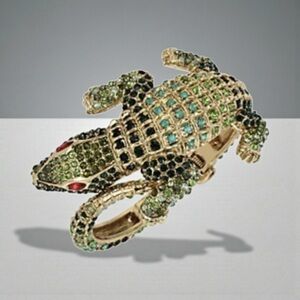 Betsey Johnson- Gold-tone alligator cuff bracelet with green and red accents. Eye-catching and unique design. Limited Edition. Multicolor Rhinestone Bling. Pouch and box included.
