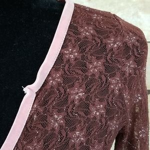 This elegant lace V-neck top features a beautiful brown design with a subtle pink trim. Perfect for adding a touch of sophistication to any outfit.